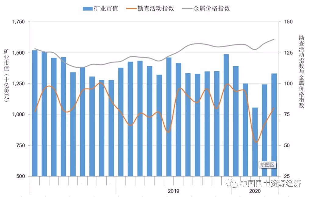 全球地質(zhì)勘查活動(dòng)指數(shù)先抑后揚(yáng)。2020年1—5月,全球地質(zhì)勘查活動(dòng)指數(shù)先抑后揚(yáng),3月為最低值53.3點(diǎn),5月反彈至80.5點(diǎn),均值為77.6點(diǎn),高出2019年同期3.9個(gè)點(diǎn)。全球金屬價(jià)格指數(shù)與全球地質(zhì)勘查活動(dòng)指數(shù)走勢一致,1—5月均值為131.7點(diǎn),高出2019年同期11.7個(gè)點(diǎn)。全球礦業(yè)市值3月觸底,為10564億美元,5月反彈至13312億美元,均值為12552億美元,與2019年同期相比減少9.8個(gè)百分點(diǎn)。(參見圖3)